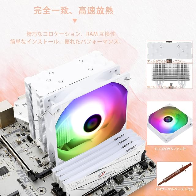 Thermalright Assassin King 120 SE White ARGB CPUエアクーラー、4本のホットパイプ、C 12 CW-S PWM静音ファンCPUクーラー、S-FDBベアリング付き、AMD AM4 AM5/Intel LGA 1700/1150/1151/1155/1156/1200、PC冷却器に適用、cpuファン、cpu fan、空冷cpuクーラー