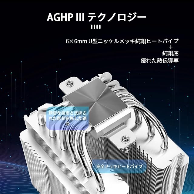 【AGHP技術】6×6 mmヒートパイプはAGHP技術を用いて,垂直/水平方向による逆重力効果を解決し。6本の純銅焼結熱管&PWMファン&純銅ベース&全めっき還流溶接技術、CPUヒートシンクが作動する時、超静音気流ファンを組み合わせて、極致のCPU放熱性能を達成することを目的とする