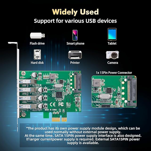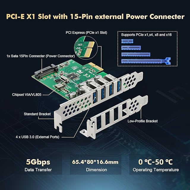 Binardat PCIEから4ポートUSB 3.0拡張カード、セルフパワー、ロープロファイルブラケット、Windows 10/11用USB3ハブコントローラアダプタ