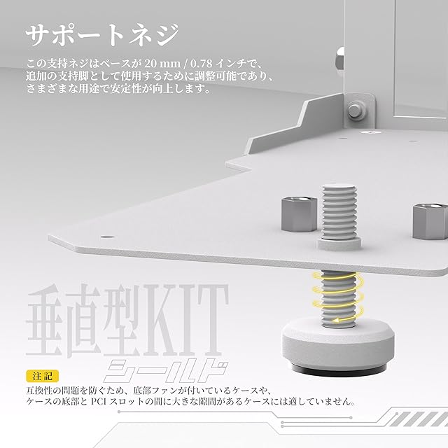 シンプルかつ頑丈な垂直ディスプレイ: 簡単に取り付けられるように設計されたこのマウントにより、GPU の見事な垂直プレゼンテーションが可能になります。 追加された調整可能なサポートネジにより、安定性が向上し、独特の存在感がされます。