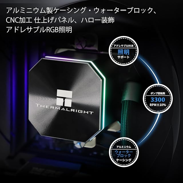 【高性能クーラーヘッド】オールメタルクーラーヘッドを備えた第4世代のポンプボディフレームは、低熱抵抗、ポンプ本体周りのARGBハロー、最大40,000時間のウォータークーラーヘッド寿命、最大3300RPM ±10%の速度を備えた優れた熱伝導率技術を備えており、低振動で動作するだけでなく、長く優れたCPU冷却をします。