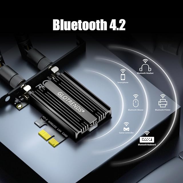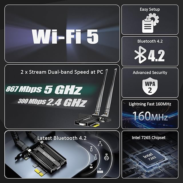 GLOTRENDS AC1200 WiFi 5 PCIeカード、デスクトップPC用薄型ブラケット、Intel 7265チップ、802.11ac、Bluetooth 4.2、Windows 11/10/7/Linux対応、Mac OS/Windows XP非対応