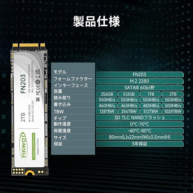 Fikwot FN203 2TB M.2 SATA SSD SLC キャッシュ 3D NAND TLC SATA III 6Gb/s M.2 2280 NGFF 内蔵 SSD 最大読込: 550MB/s 最大書き:480MB/s Ultrabook、タブレット コンピューター、ミニ PC と互換性あり