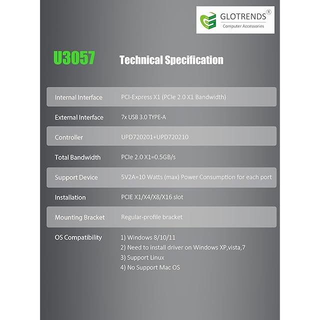 GLOTRENDS U3057 7ポートUSB 3.0 Type-A 5Gb PCIe拡張カード、Intel、AMD、ARMプラットフォーム用、WindowsおよびLinuxと互換性あり(Mac OSはサポートしません)