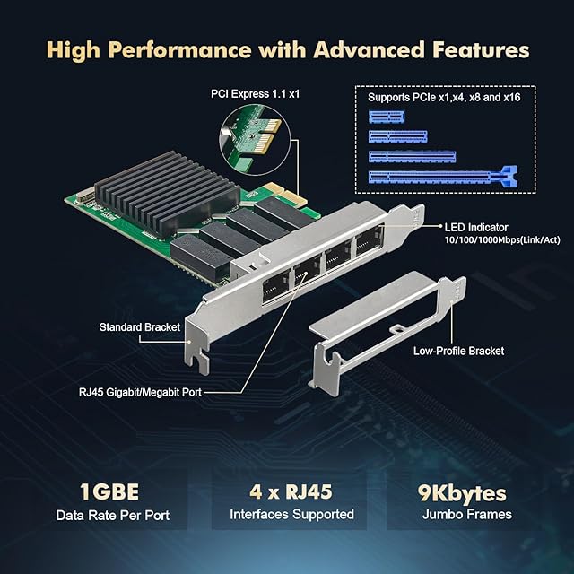 【クアッドポートギガビット】ネットワークカードには4ポートギガビットイーサネットRJ45インターフェースがあり、Realtek RT8111Hチップ、100M/10Mオートネゴシエーションに対応、最大100m(328フィート)の距離で標準のCat5e以上のUTPをサポート。