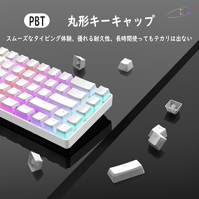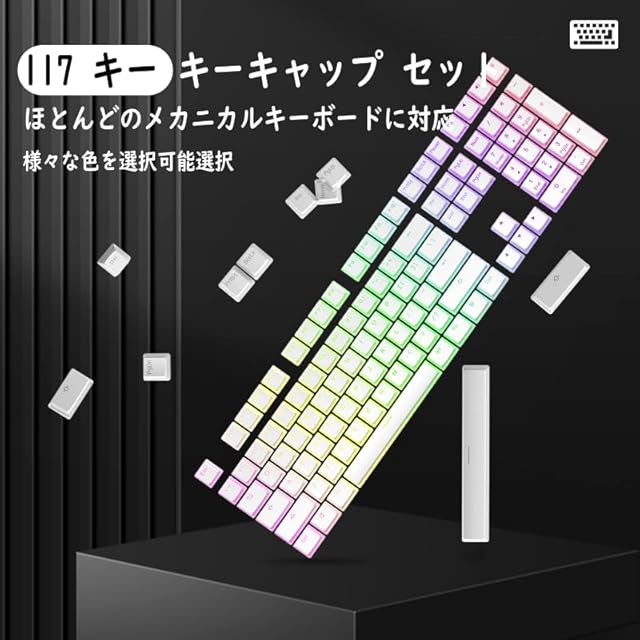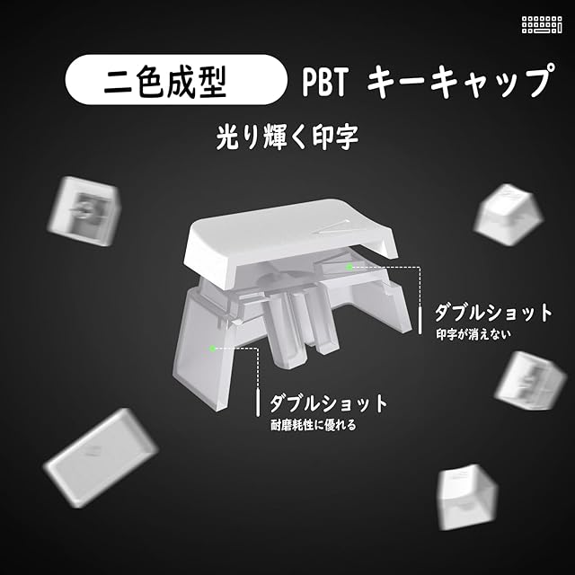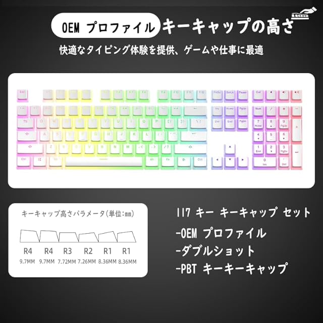 【高品質のPBT素材?耐久性と】内PBT素材、表面はマット処理されており、ABS素材と比べて耐久性が優れ、高硬度、耐摩耗性、肌触りが快適です。ゲームやタイピングをする時に最高の体験を提供します。OEM高さ、線が滑らかで、人体工学の階段弧度設計を採用しています。ゲームやタイピングをする時に最高の体験を提供します。また、キーキャップは、長持ちする耐久性と性能を確保するために特殊なダブルショットインジェクションで形成されています。文字は長時間使用しても薄くなりにくいレーザー刻印を施しています。