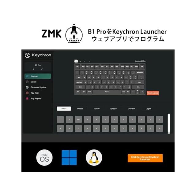 ウェブアプリで任意のキーをプログラム - MacOS、Windows、Linuxを問わず、Keychron Launcherウェブアプリ(ダウンロード不要)または最新のChrome、Edge、Operaブラウザ上のZMKファームウェアで任意のキーとマクロをリマップできます。