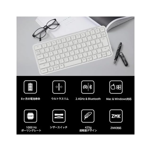 Keychron B1 Proは、シザースイッチを採用し、軽量、超薄型のワイヤレスキーボードで、1,200時間の長時間駆動を実現。2.4GHzワイヤレス、Bluetooth、有線モードに対応し、スマートフォン、タブレット、PC、Macに簡単に接続できます。ZMKのカスタマイズ機能により、自宅、オフィス、旅行など、用途に合わせた設定が可能です。また、シリコンカバーが付属します。