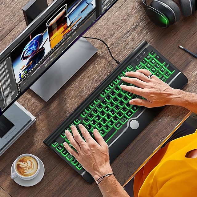 BERGUF 大きめの文字のバックライト付きキーボード、静かなUSB有線コンピューターキーボード、光るホワイトLED付きフルサイズキーボード Windowsデスクトップ、ノートパソコン、PC、ゲームに対応、ブラック (特大)