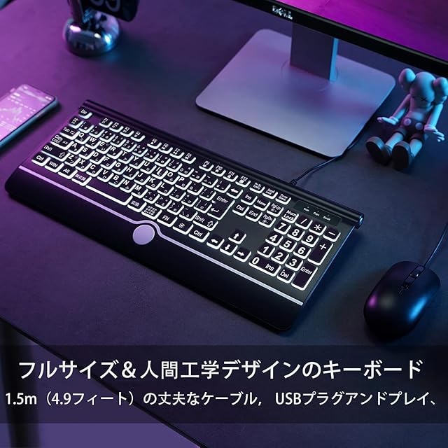 【大きめの文字のキーボード】- 大型のキーにはかすかな隙間があり、大きめの文字がプリントされているので、タイピングミスをしにくくなります。高齢者、視覚障害者、学校、特別支援の場、図書館、事業所などに最適です。