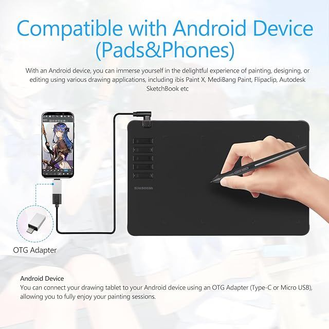 【互換性】:先進技術を取り入れたT605Sペンタブレットは、ウィンドウズOS XP/7/8/10以降とMac 10.12以降に対応するだけでなく、アンドロイド6.0以降にも対応しています。重いパソコンを持ち運ぶことなく、外出先でもいつでもスマートフォンを持ち運び、T605Sペンタブレットを接続して使用することができます。 OTGコネクタ: OTG機能に対応したスマートフォンと接続するためのType-C OTGコネクタが付属しています、Android6.0以上対応できます。
