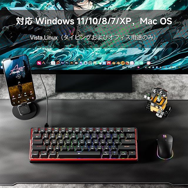 【60%コンパクト配列】スタイリッシュで省スペースな61キー設計、持ち運びにも便利でデスク環境をすっきり整理