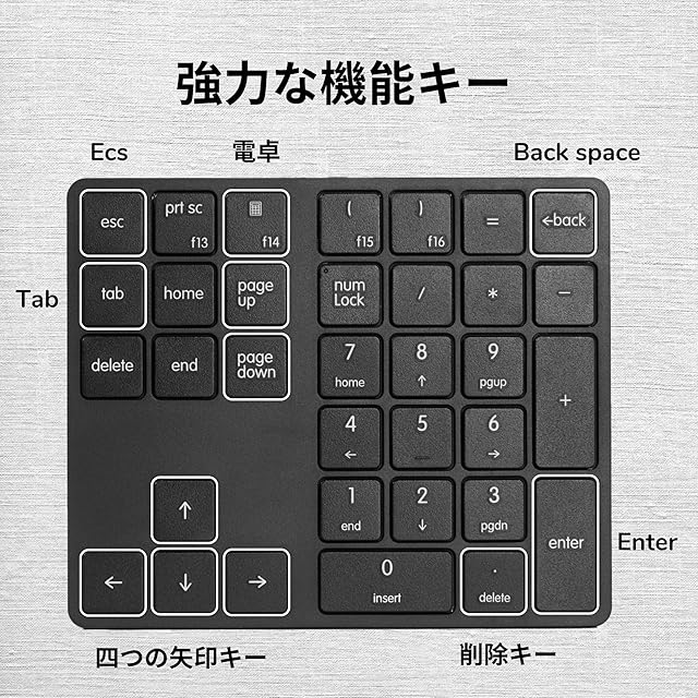 34キーのテンキー:このテンキーは大量の打字タスク向けに設計されています。これらの34のキーには、一般的に使用されるデジタル処理機能が含まれており、メインキーボードとコンピューターのテンキーの間で手の移動が必要ありません。このキーボードには、Esc、Tab、Back Space、Delete、Home、End、Prt sc、および四方向の矢印キーなどの重要なキーも組み込まれています。また、いつでもキーボードの計算機能を便利に起動できるように、電卓のショートカットキーも含まれています。