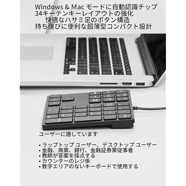 【34キーテンキー&より多くの機能を実現】このテンキーは34キーで、数字キーと方向キー、“()”“Delete”などよく使用されるキーが搭載され、非常に便利です。仕事、娯楽、ゲームなどに適用しています。適合対象:ノートパソコン ユーザー,金融、商業、銀行、金融証券勤務者,カウンターのレジ係,数字エリアのないメカニカルキーボードと一緒に使用。