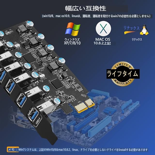 7ポートUSB拡張カード: このUP7000は、PCI Express (1X)インターフェイスを介してデスクトップコンピュータに7X USBポート(7ポートUSB-A)を追加することができます。追加のUSB 3.0ポートは、オーディオ、写真、およびより多くのファイルデータ転送用に最大5Gbpsの超高速速度を提供することができます。