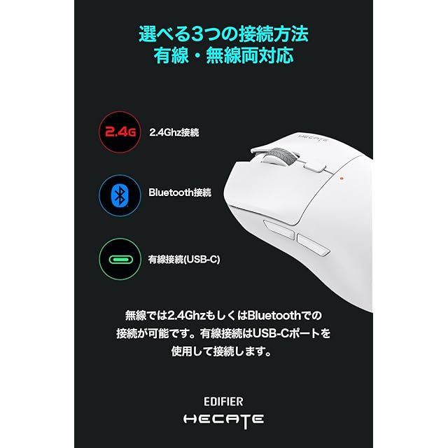 Edifier HECATE G3M PRO ゲーミングマウス ワイヤレス Bluetooth 2.4Ghz 有線 3タイプ接続対応 軽量63g PAW3395(26,000dpi / 650IPS) ホワイト 【日本正規代理店品】 ED-G3MPRO-WH