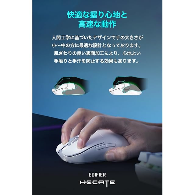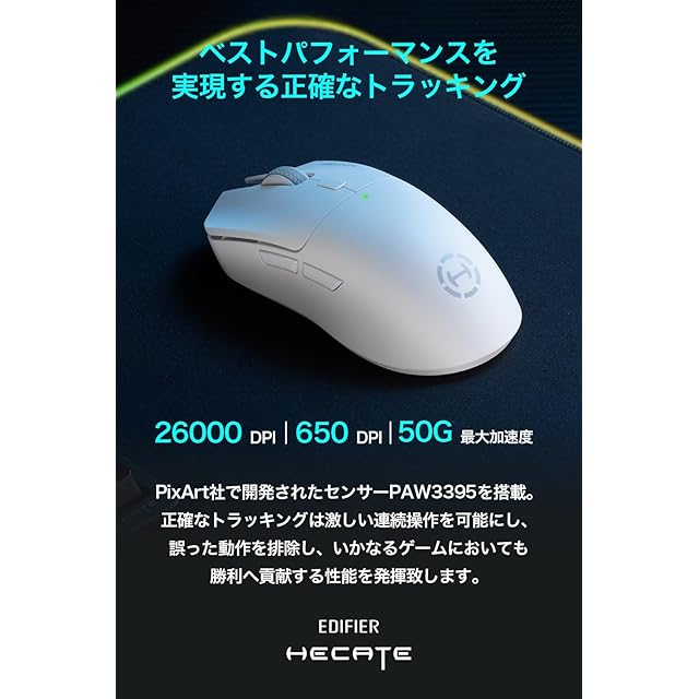 Edifier HECATE G3M PROはトリプルモード接続に対応した軽量なワイヤレスゲーミングマウスです。高品質なPixArt社のPAW3395を搭載し、26000DPI / 650IPS / 50G最大加速度の正確なトラッキングを実現いたしました。底面にはデュアルモードスイッチを搭載し、クリック感のあるゲームモードと静音スイッチの静音モードの2つの異なるクリック感を選べます。2.4Ghz、Bluetooth、USB-Cの3つの入力系統に対応し無線・有線両対応しております。※Bluetooth、ワイヤレス製品の為ご使用環境により接続状態が不安定になる場合があります。