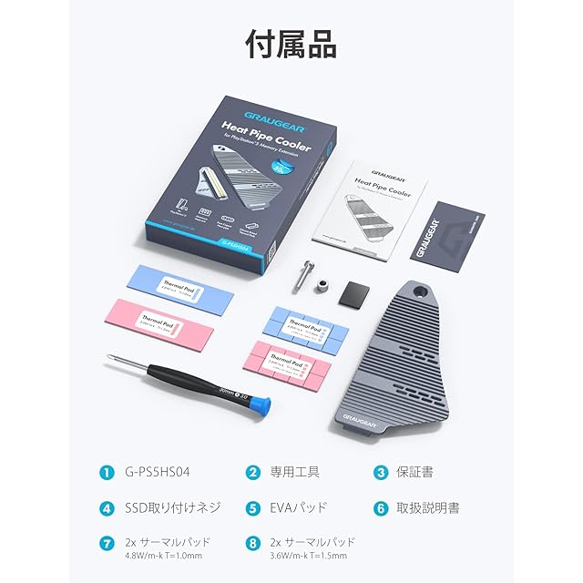 【付属品】GRAUGEAR PS5専用 M.2 NVMe SSDヒートシンク、サーマルパッド(ブルー:1.0mm、4.8W / m-k、ピンク:1.5mm、3.6W / m-k)、ドライバー、ネジ、書、取扱説明書。