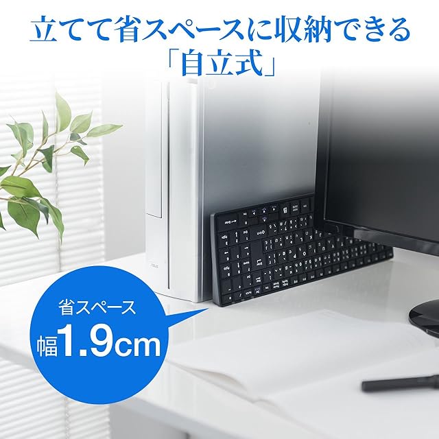 従来のパンタグラフキーボードに比べ、キータッチ音が約1/3の静音設計の為、音を立てたくない場所に最適です。 繰り返し充電して、約3時間の充電で約180時間の連続使用が可能です。