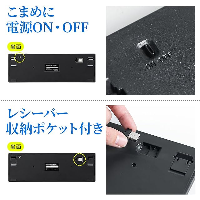 裏面に電源ON・OFFスイッチが付いており、バッテリーの無駄な消耗を軽減できます。USBポートに接続しても邪魔にならない小型レシーバーを採用しています。