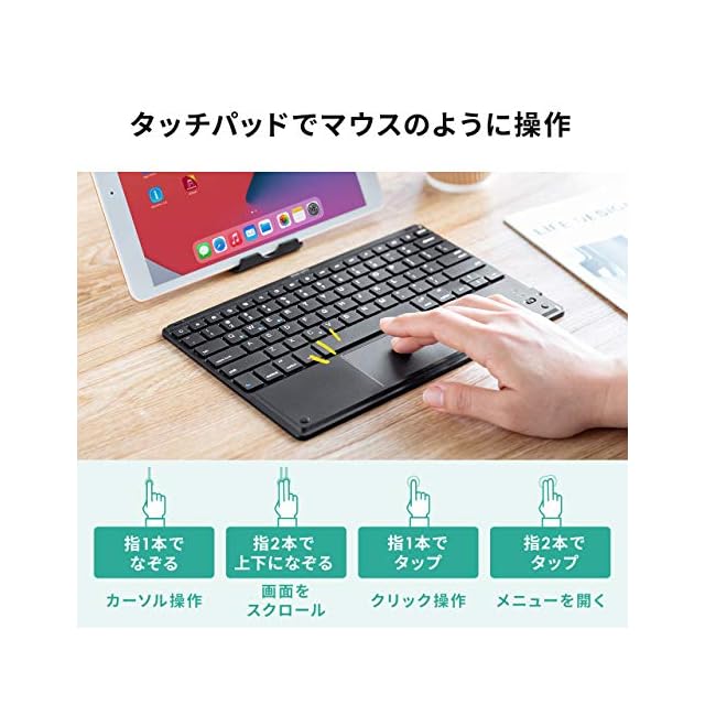 タッチパッドのON・OFFを切り替えることも可能です。持ち運びやすい薄型形状です。角度調整可能な、iPadやiPhoneに使えるスタンドを付属しております。
