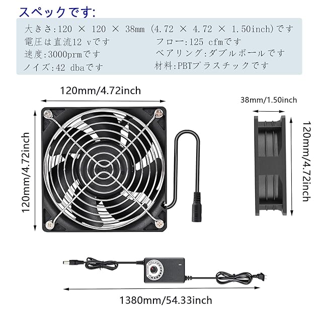 パラメータ:120(w) x 120(l) x 38(h)mm (4.72 x 4.72 x 1.5インチ)。定格電圧:dc 12 v、定格電流:2.7 amp、定格速度:3000 rpm、空気の流れ:125 cfm;ノイズ:30 dba;コネクタ:dc 5.5x2.1mmメス
