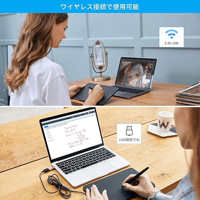 【携帯で使えるペンタブ】PC(Windows・Mac)はもちろん、Android6.0以降のスマホとタブレットにも対応します。使い方は簡単です。事前に対応描画ソフトをインストールして、付属のOTGアダプターでスマホに接続したら、すぐに絵を描き始められます。2種のOTGアダプタが付属しているので、別途用意する必要はありません。デジタル作画がいつでもできる。