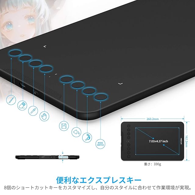 【製品特徴】Deco mini 7Wは2.4 Ghz接続のワイヤレス技術によって、スピーディーな作業を実現しました。作業スペースは7 * 4インチ(約177.9 * 111.1mm)、厚さ9.3mm、重さ330g。8個のショートカットキーをカスタマイズし、自分のスタイルに合わせた作業環境が実現できます。持ち運びに便利。