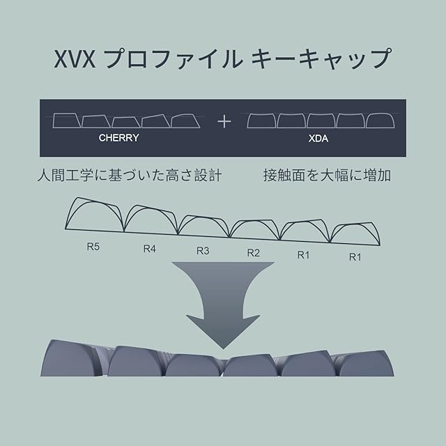 【XVXプロファイル】XVXプロファイルのキーキャップは、Cherryプロファイルと同様の人間工学に基づいた高さ設計で、指とキーキャップの接触面を増やしながら、快適なタイピングエクスペリエンスをもたらしてくれます。