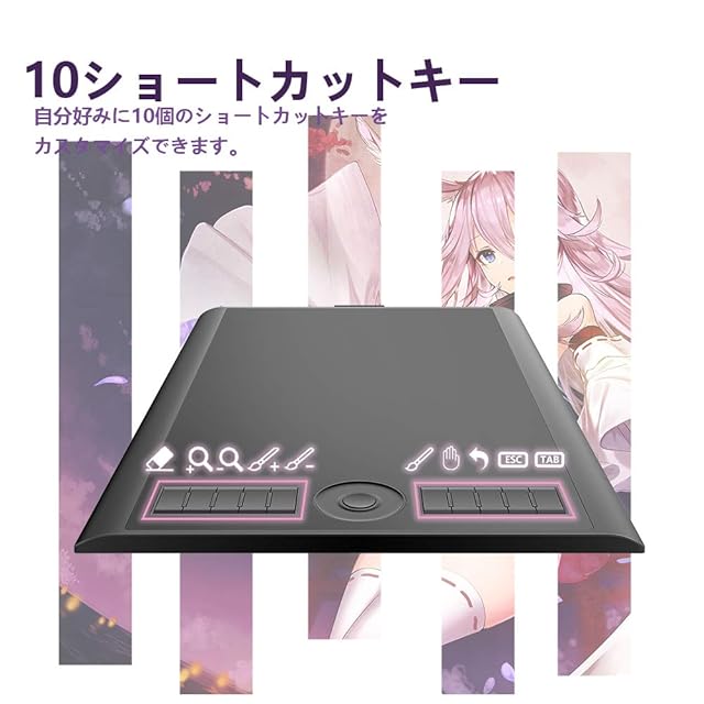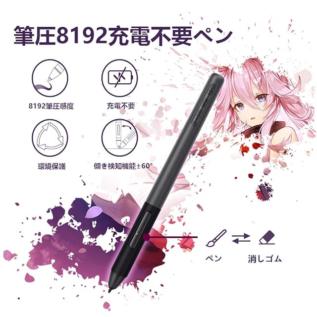 【傾き検知可能】--ペンを傾けると、傾斜角度が大きくなるほど線が太くなります。逆に線を引くと細くなります。デジタル創作の楽しさが大幅に向上します。【電源不要ペン】--M10K PROペンタブレットは、バッテリー不要のペンを使用します。 交換用の8つのペン先もパッケジに付属します。 【8192レベルの筆圧】--筆圧感度が高いため、線の太さ・色の深さの微妙な変化をよりよく制御できます。