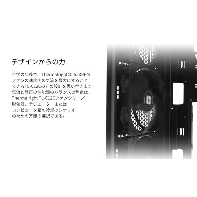 【静音ファンサイズ】について モデル TL-C12C、サイズ:120*120*25mm、回転数:1550RPM±10%、ノイズ≦25.6dBA コネクタ。4pin pwm、電流:0.20A、気圧:1.53mm H2O、風量:66.17CFM、より高い風量で冷却性能を向上させることができます。