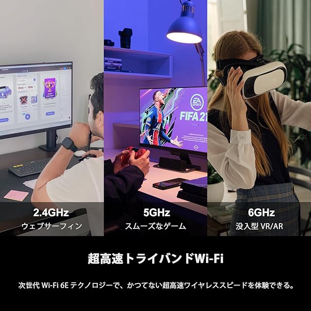 【次世代 WiFi 6E へのアップグレード】: より大容量でパフォーマンスが向上したWiFi 6E ネットワーク カードは、OFDMA、MU-MIMO、1024QAM、ターゲット ウェイク タイム (TWT) などの最新の 802.11ax テクノロジーを対応しています。高密度または混雑した環境でも高速データ転送を実現し、超低遅延の極速ゲーム体験を提供します。