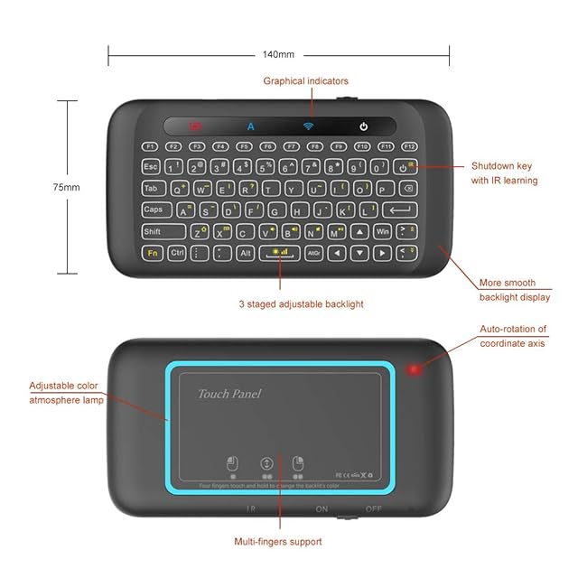 この2.4GHzミニワイヤレスタッチパッド&キーボードコンボはあなたに彼らのPC、スマートテレビ、アンドロイドテレビボックス、PC、そしてラップトップを操作するためのユニークで有能なツールを提供することができます。それはプラグアンドプレイ、シンプルでスムーズです。あなたのソファの上にあなたのAndroidボックスやスマートテレビでそれを使用するか、最も快適な方法でインターネットを閲覧する。<br /> <br /> <strong>仕様:</strong><br /> 伝送モード:GFSK 2.4GHzワイヤレス<br /> リモートコントロール距離:最大10メートル<br /> 電池:320mAh充電式ポリマーリチウムイオン電池<br /> 労働時間:約9時間<br /> 充電時間:約1.5時間<br /> 動作電流:<15mA(バックライトオフ)<br /> 睡眠電流:<100uA<br /> カラー:ブラック<br /> メインサイズ:14.2 * 7.5 * 1.0cm / 5.59 * 2.95 * 0.39in<br /> 本体の重さ:99g / 3.50oz<br /> パッケージサイズ:16.2 * 12.6 * 1.8 cm / 6.37 * 4.96 * 0.70インチ<br /> パッケージの重さ:144g / 5.07oz<br /> <br /> <strong>パッケージ一覧</strong><br /> 1 *ワイヤレスタッチパッド&キーボード<br /> 1 * USBレシーバー<br /> 1 * USB充電ケーブル<br /> 1 *英語ユーザーマニュアル
