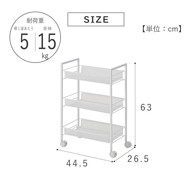 【耐荷重】全体:15㎏ 棚1段あたり:5㎏ 【素材】スチール・PP・エポキシ樹脂塗装