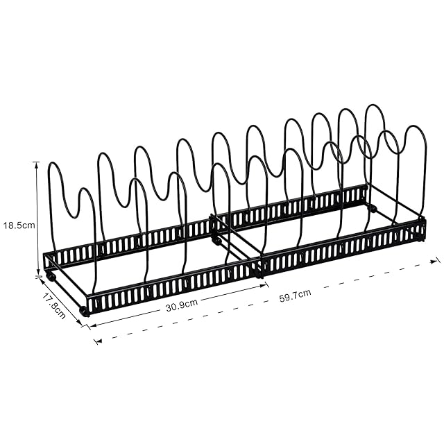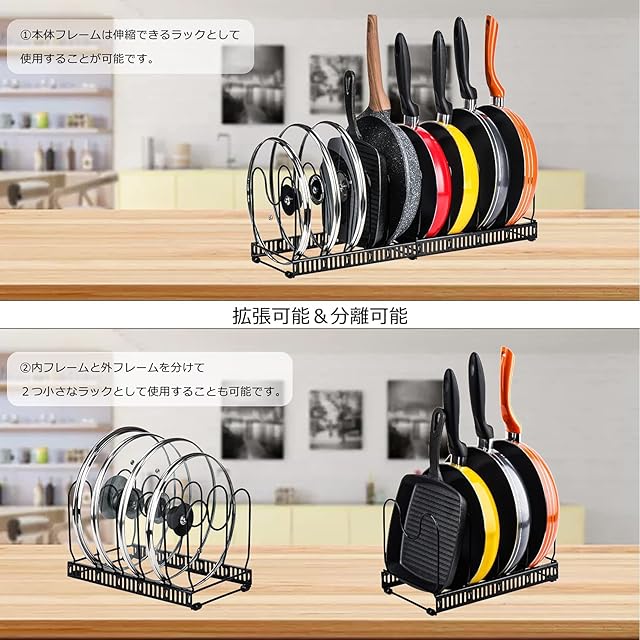 【伸縮可能なフライパンスタンド】本体は二つのフレームに組み合わせ、30.9cmから59.7cmまでに伸縮できます!仕切りパーツ10本が付属しており、フライパン、鍋や蓋などの厚みに合わせて調整可能です。