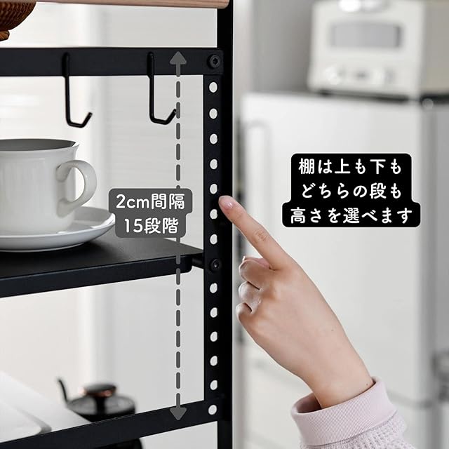 【棚板の高さが変えられる】棚板の高さが2㎝ピッチ15段階で細かく変えられるので、収納したい物に合わせて調節できます。