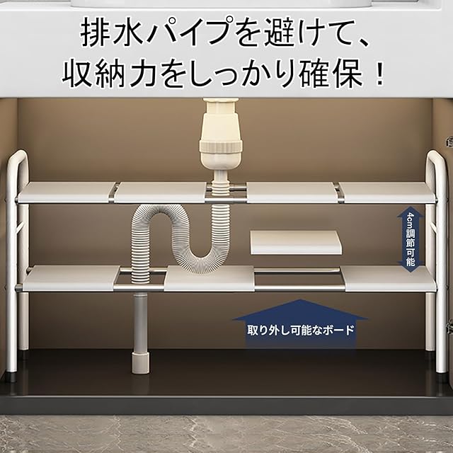 【横幅・高さ自由調整可能】いつでも取り出せる棚板や、伸ばしてシンク下に置ける長いロッドもあるので、シンク下の排水トラップも気になりません。 シーンに合わせて棚の長さを調整でき、高さも2種類から選べます。