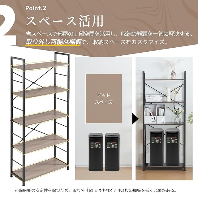 【スペース有効活用】スペースを最大限に活用し、スリムデスクとして設置できるため、狭いスペースでも使用可能です。5段のラックは本や飾り物、書類などを整理整頓するのに最適で、日常の必需品を収納しながら、センスと生活のスタイルをアピールできます。
