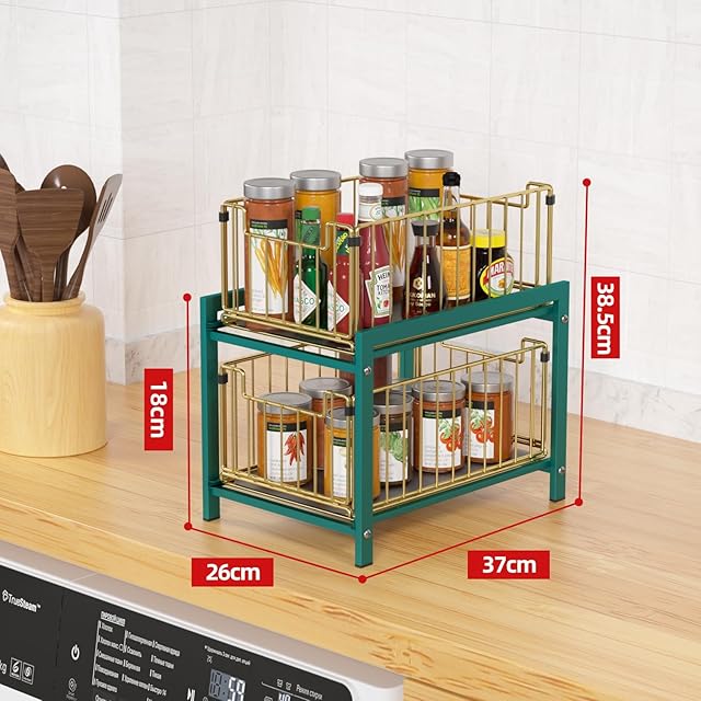 Dopool キッチン収納 シンク下収納 スライドラック 2段 引き出し付き 大容量 洗面所収納 スリム おしゃれ 安定性 30KGまで対応 (Green+gold)