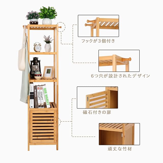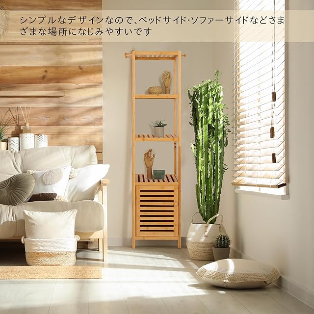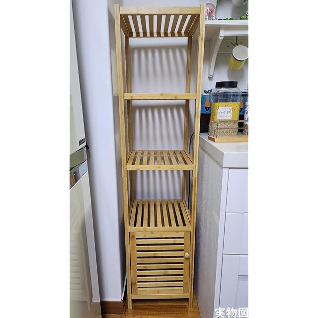 UNHO オープンシェルフ―幅33.8cm <br>主な材質:天然竹 <br>オープンシェルフのサイズ:33.8x33x140cm <br>正味重量:7.1kg <br>用途: <br>①キッチン、浴室、玄関の収納ラックとして使用することができ、収納スペースを最大限に活用するので、スッキリおしゃれに整理整頓できます。 <br>②フラワースタンドとして活用することができ、植木鉢と花瓶を飾るとリビングやバルコニーがぱっと華やかになります。 <br>応用場所:キッチン、リビング、浴室、寝室、ベランダなど <br>特徴: <br>天然竹材は自然のあたたかさを感じるような、ぬくもりのある木目調が持ち味です。天然竹は長く使えば使うほどに味わい深くなることができます。 <br>竹は頑丈でありながら軽いなので、オープンシェルフは持ち運びやすいです。 <br>上4段の棚板1段あたり5kgに耐えられたため、調味料や写真立て、観葉植物など様々な物品を飾ることができます。底の箱の耐荷重は10kgなので、重い物を置くことができます。 <br>上3段は【見せる収納】なので、多種多様な観葉植物や置物、時計などの生活を豊かにしてくれるアイテムを飾ることができ、居心地の良い空間を演出できます。下段は【隠す収納】で、扉付きなので、ごちゃごちゃとした小物類を底の箱に入れるだけで部屋をすっきりとさせることができます。 <br>キッチンに収納ラックを設置すると、食材や調味料などの収納に便利になり、作業効率が格段にアップできます。浴室に収納ラックを設置する際には、タオルや衣類の一時保管ことができます。リビング収納ラックを設置すると、植物や写真立てなどを飾ることもできます。 <br>フラワースタンドとして使用すると、すのこのような棚は水はけや風通しのよく、通気性に優れたので、植物を育てるのにもぴったりの環境を作れます。 <br> <br>パッケージ内容: <br>オープンシェルフx1 <br>取扱説明書x1 <br>梱包サイズ:79x36.3x15cm <br>総重量:7.8kg <br>:万が一、不具合な商品(キズ、部品不足など)を届けた場合なら、返 品が要らずに無 償で再 送することが対応しておりますので、「販売元」をクリックし、お気軽に直接に弊店にご連絡ください。