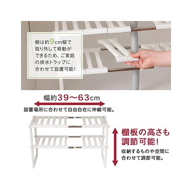 コモライフ 伸縮式の整理ラック 伸縮 キッチンラック 収納 食器棚 可動棚 組立式 シンク下 収納 洗面台