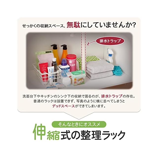 商品名:コモライフ 伸縮式の整理ラック 伸縮 キッチンラック 収納 食器棚 可動棚 組立式 シンク下 収納 洗面台