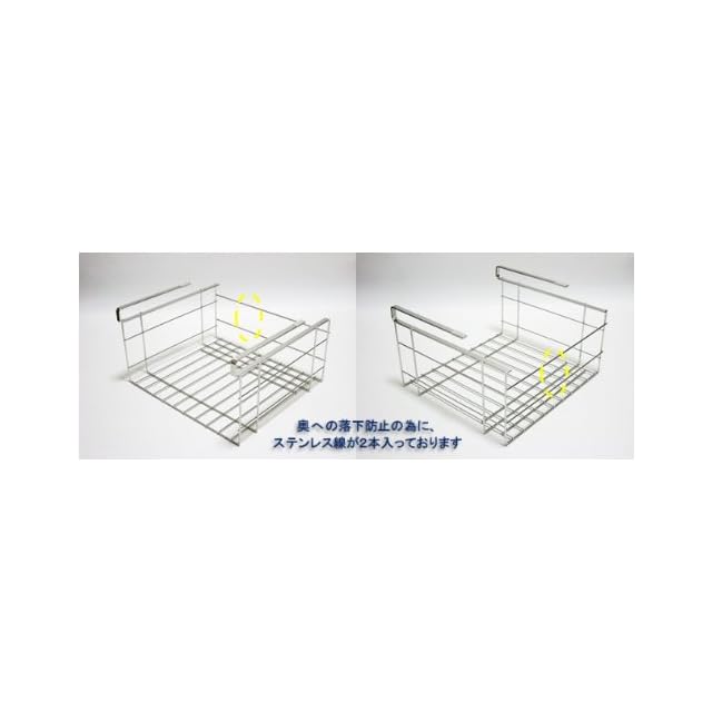 吊り戸棚の棚板に差し込んで使える、水やサビに強いステンレス製のバスケットです