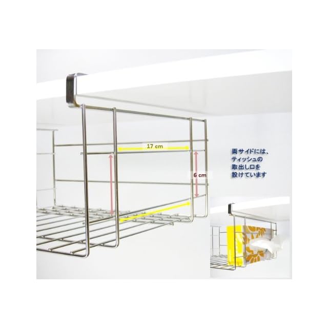 【日本製】取り付け簡単な吊り戸棚下収納。調味料やお弁当箱・鍋や卵焼き器が入る吊り戸棚下ラック。両サイドにはティッシュ専用取り出し口付。