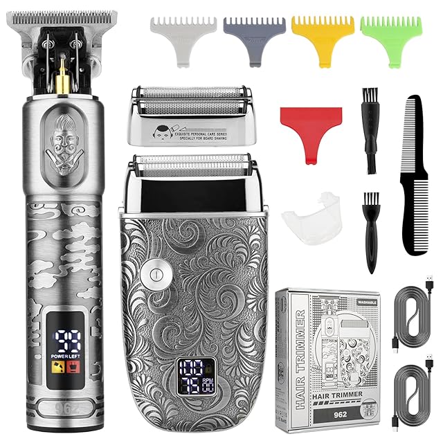 GSKY バリカンセット 電動バリカン ひげそり 理髪美容セット USB充電式 LCD表示 自動研磨 メンズシェーバー 低騒音 家庭 業務 ショートヘア用 セルフカット( グレー)