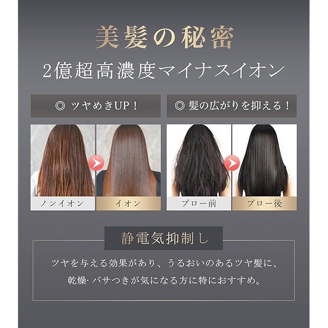 【髪へのやさしさ】2億超高濃度マイナスイオンで静電気を抑制し、髪にツヤと潤いを与えます。傷んだ髪の毛をイオンコーティングしながらケア。温冷リズムモードを搭載、 温風と冷風を自動で切り替えることで、熱ダメージから髪を守り、ツヤのある仕上がりを実現します。髪と頭皮の両方をケアするプロ仕様のヘアドライヤーです。