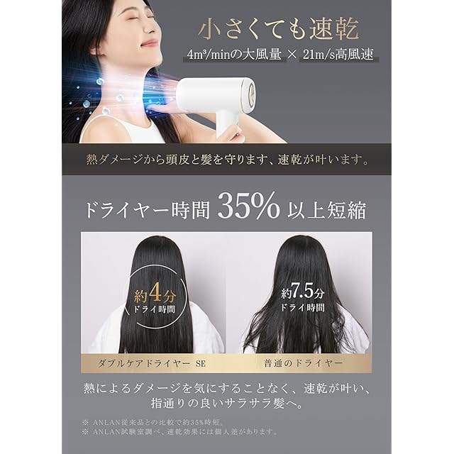 【プロ仕様の速乾ドライヤー】ANLANダブルケアドライヤーSEは約11万回RPMの高性能モーターを搭載して圧倒的な大風量と高速風のヘアドライヤーを実現。4m³/minの大風量と21m/sの高風速で、熱ダメージを気にせず、ドライ時間を35%以上短縮できます。圧倒的な速乾力で、熱ダメージから頭皮と髪を守ってツヤ髪を叶える。忙しい朝でも、素早く髪を乾かしたい方におすすめです。