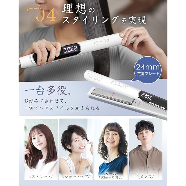 【24mmプレート&2wayカール&ストレート】ヘアアイロンの24mmプレートで、ストレートはもちろん、カールの場合は、コテ32mmと同じです。これ一本で、カールとストレート、その日の気分に合わせて、スタイリングを楽しめます。初心者の方でも思い通りのヘアセットが可能になります。ショートヘアからロングヘアまで万能に使えるので、男女両用タイプです。