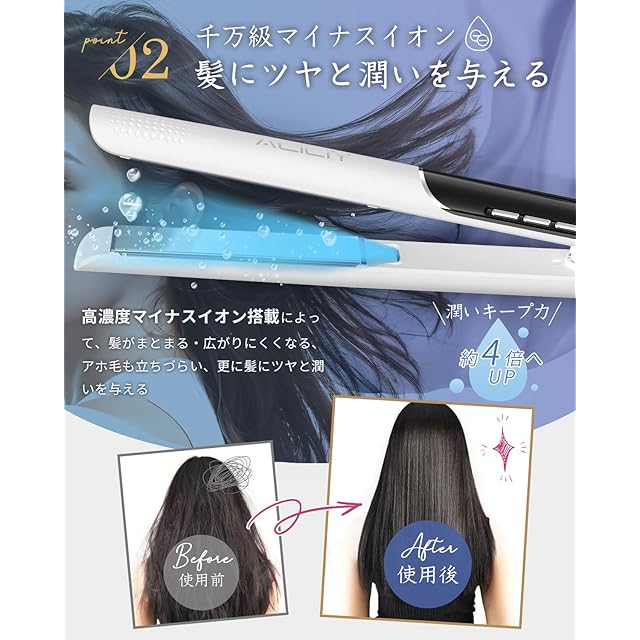 【チタンヘアアイロン&3Dクッションプレート】Aliliy ヘアアイロンは鏡のようなミラーチタニウムプレートを採用し、滑りやすさと熱伝導性の高さによって、熱や摩擦によるダメージを抑えながら、ツヤと潤いのある髪に仕上げます。また、従来製品より3倍滑らかなプレートを搭載することで摩擦による髪のダメージを抑えます。滑らかなプレートで髪が引っ張らない。また立ち上がりが速い(180℃の場合約25秒)、忙しい朝でも時短スタイリングを可能です。上下自由に動く3Dクッションプレートでどんな方向からも均一に力が入るので、自然に綺麗なストレートになります。更に耐久性に優れているので、長期間使える点も魅力です。
