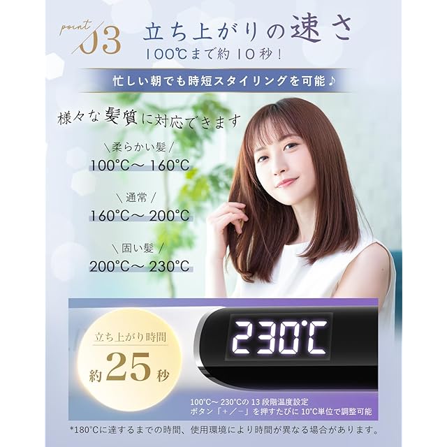 【100~230℃温度設定&ディスプレイ表示&1時間自動電源OFF】ストレートアイロンが100℃~230℃の13段階(設定単位:10℃)温度設定、髪質に合わせた最適な温度で髪の美しさを最大限に引き出す事が可能です。「+/-」ボタンを短押しで温度を小刻みに調整、最低温度100℃から最高温度230℃まで設定可能。長押しで希望の温度を素早く設定可能、様々な髪質に対応できます。ディスプレイ表示付き、高級感にたっぷり、現在の温度を素早く把握することができます。電源をONにしてから、1時間後自動的に電源がOFFになります、万が一の消し忘れにも安心です。